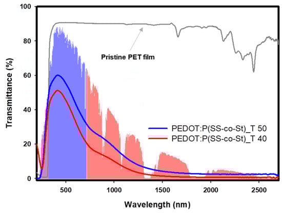 Transmittance spectra of PEDOT:P(SS-co-St) films with transmittance of 40% and 50% at 550 nm. For comparison, the standard solar irradiation spectrum and the transmittance spectrum of the pristine PET film are provided.