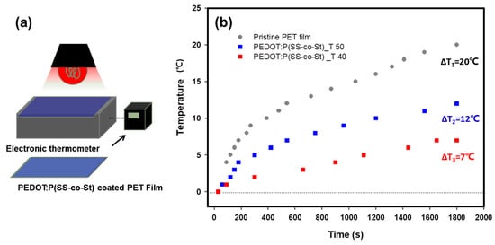 Based on the aforementioned optical properties of the PEDOT:P(SS-co-St) films, it is reasonable to suggest that these films show great potential for application as NIR-shielding films. Figure 7a illustrates the thermal insulation experiment which was conducted, wherein a window of a sealed box was covered with bare PET or PEDOT:P(SS-co-St)-coated PET films and placed under an IR lamp. Figure 7b shows the temperature variations inside the box after irradiation for 2000 s, and indicates the overall variation between the initial and final temperatures. When the box was covered with a glass slide and a bare PET film was placed over the glass, the temperature increased significantly as irradiation time progressed (ΔT1 = 20 °C). The bare PET film thus did not provide any NIR shielding. This configuration was thus taken as a reference for comparison with the synthesized films. In contrast, the heating rate in the box covered with the glass slide and a PEDOT:P(SS-co-St) film was much lower than in the reference configuration. Further, the heating rate inside the box decreased distinctly as the film thickness was increased. After irradiation for 2000 s, the overall temperature variation in the box covered with the PEDOT:P(SS-co-St) film with 50% transmittance (T 50 in Figure 7b; ΔT2 = 12 °C), was lower than that for the reference configuration. Further, the temperature change in the box covered by the film with lower transmittance (40%; T 40) was even lower (ΔT3 = 7 °C). All PEDOT:P(SS-co-St) films were, thus, shown to provide good thermal insulation.