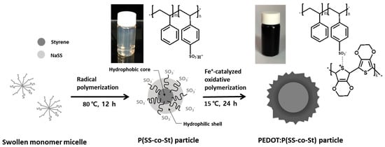4-Styrenesulfonic acid sodium salt hydrate (NaSS), styrene (St; 99%) and 3,4-ethylenedioxythiophene (EDOT; 97%) were purchased from Sigma-Aldrich (St. Louis, MO, USA) and were used without further purification. Sodium persulfate (NaPS) and iron(III) sulfate pentahydrate (Fe2(SO4)3·5H2O) were obtained from Sigma-Aldrich and used without further purification as reaction initiators. Double-distilled deionized water was used in all experiments.