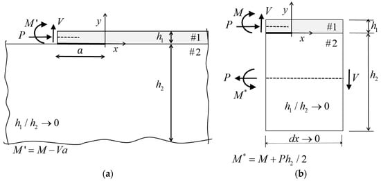 Material systems with can be studied using the semi-analytical solutions in Equation (13) and the numerical coefficients in Table 3, Table 4 and Table 5. They can be applied also to problems with large deformations, e.g., buckle-driven delamination or peeling problems if the crack tip forces are previously calculated using a model which accounts for the geometrical nonlinearities [16,26]. Both analytical and semi-analytical solutions presented in this paper account for the presence of crack tip shear. This contribution is often neglected under the assumption that the effect of the shear becomes negligible for long cracks. This is indeed correct. However, a simple example may clarify the importance of shear in problems where the layer is subjected to a transverse load, e.g., in a blister test, peel test, or SCB face/core interface characterization sandwich testing. Consider the problem in Figure 1 and assume that only a transverse load acts at a distance from the crack tip (similar to a shaft-loaded blister test but with free rotations at the layer end). The transverse load will induce a bending moment, , and shear, , at the crack tip, Figure 1b. The energy release rate of Equation (13) then simplifies: