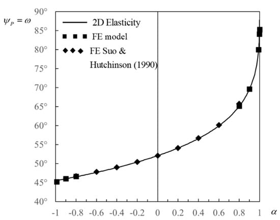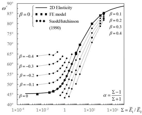 Results will be presented in this paper assuming . The choice of is arbitrary, since the phase angle at a different reference length is given by [40]; as a consequence, the interfacial fracture toughness defined through fracture experiments will depend on the mode mixity and on the value of used to define [35,42].
