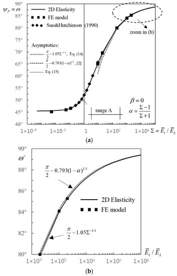 (a) Mode mixity phase angle as a function of . The analytical results are compared with numerical results and with the asymptotics derived here and in [2]. (b) The zoom for large values of . Range A in (a) is the interval where the asymptotics and expansions in Equations (14)–(16) do not ensure uncertainties below 0.2°.