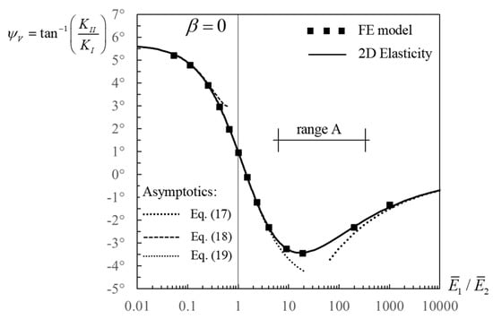 The absolute error between the finite element based CSDE results and the analytical results is always below 0.04° on the phase angle, and below on the dimensionless stress intensity factors for ; errors are slightly larger for and , but always below 0.2° and . The results have also been successfully compared with solutions in the literature [25,26] (a discrepancy is observed in the solutions for pure shear loading and in [26]; given the agreement with the analytical solution, the present results appear to be more accurate). The results in Figure 2 and Figure 3 show large variations for , which corresponds to stiff layers on soft material substrates. These cases will be examined later in Section 3.3, where extreme asymptotics of the analytical solutions will be derived.