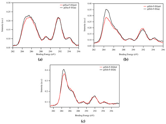 Area-normalized XPS C(1s) spectra (φ = 70°) for the amphiphilic PDMS-based films p(Si-F-EG)4 (red) and the respective terpolymers p(Si-F-EG) (black). (a) p(Sia-F-EGa)4 and p(Sia-F-EGa); (b) p(Sib-F-EGa)4 and p(Sib-F-EGa); (c) p(Sib-F-EGb)4 and p(Sib-F-EGb).