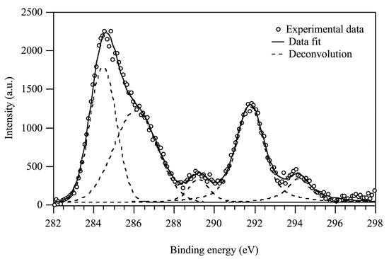 X-ray photoelectron spectroscopy (XPS) spectra were recorded by using a Perkin-Elmer PHI 5600 spectrometer (Chanhassen, MN, USA) with a standard Al-Kα source (1486.6 eV) operating at 300 W. The working pressure was less than 10–8 Pa. The spectrometer was calibrated by assuming the binding energy (BE) of the Au 4f7/2 line to be 84.0 eV with respect to the Fermi level. Extended (survey) spectra were collected in the range 0−1350 eV (187.85 eV pass energy, 0.4 eV step, 0.05 s step–1). Detailed spectra were recorded for the following regions: C(1s), O(1s), Si(2p) and F(1s) (11.75 eV pass energy, 0.1 eV step, 0.1 s step–1). The standard deviation (SD) in the BE values of the XPS line was 0.1 eV. The spectra were recorded at two photoemission angles φ (between the surface normal and the path taken by the photoelectrons) of 70° and 20°, corresponding to sampling depths d of ~3 nm and ~9 nm, respectively (d = d0 cosφ, where d0 is the maximum information depth (d0 ~10 nm for the C(1s) line)). The software used for background subtraction (Shirley type) [43] and quantitative analysis was the PHI software (version 5.2) for data collection in PHI 5600ci Multitechnique (Chanhassen, MN, USA). The atomic percentage was evaluated using the PHI sensitivity factors (considering both the cross-section and the beam out depth) with triplicate measurements on different film spots and the estimated experimental error was ±0.5% [44]. To take into account charging problems, the C(1s) peak was considered at 284.5 eV and the peak BE differences were evaluated. The XPS peak fitting procedure was carried out by means of Voigt functions and the results evaluated through the χ2 function [45]. The deconvolution of XPS signals was performed with the software Igor Pro.