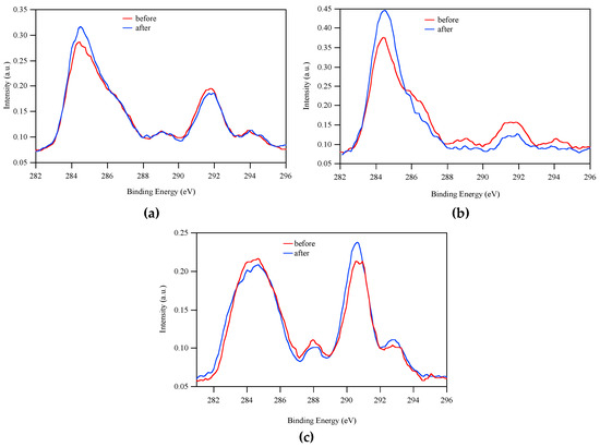 Area-normalized C(1s) XPS spectra (φ = 70°) for p(Sib-F-EGa)4 (a), p(Sib-F-EGb)4 (b) and p(Sia-F-EGa)4 (c) before (red) and after (blue) immersion in water.