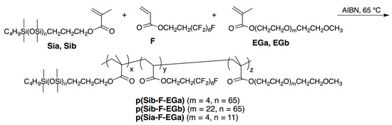 The dispersion of non-reactive surface-active additives is generally regarded as a facile and straightforward method to modify the surface properties of a polymer film without affecting its bulk properties to a significant extent [1,2,3,4]. The surface segregation process and, therefore, the selective accumulation of the additive at the interface with the external environment (air, water, organic vapors) is a complex phenomenon that depends on several factors that may add to each other, including the additive molecular structure and composition, molecular weight, surface tension, chemical compatibility with the host matrix and chemical affinity with the external environment [5,6,7,8,9,10]. A special class of surface-active additives consists of amphiphilic copolymers [11,12,13]. Random copolymers in particular have gained a great deal of interest in the last decade being their synthesis easier and more suitable for an industrial scale production than the block copolymer counterparts [14]. Notably, random copolymers have been proven to generate nanostructured materials as a result of their self-assembling in solution [15,16,17,18,19,20], bulk and at the surface of polymer thin films [4,21]. In the field of coatings, surface-active additives have been utilized for several purposes, especially for the development of antifouling (AF)/fouling-release (FR) coatings to combat marine biofouling [12]. In this regard, reactive [22,23,24,25] and non-reactive amphiphilic copolymers [21,26,27,28,29] generally composed of poly(ethylene glycol) (PEG) chains, as the hydrophilic component, and polysiloxane and/or fluoropolymer chains, as the hydrophobic component, have been investigated. The hydrophilic component of election is PEG on the basis of its known high resistance to the adhesion of proteins, bacteria, cells and marine organisms [30,31]. Moreover, fluorinated and siloxane chains, besides performing a FR action attributed to their hydrophobicity [32,33], can also play other distinct roles. In particular, fluorinated chains are anticipated to promote the diffusion and accumulation of the entire copolymer to the coating surface, as a result of their ability to self-segregate and self-organize at the outermost surface layers of polymer films [34,35,36]. Polysiloxane chains are also known to have a low surface tension behavior, albeit this character is not so distinct as for fluorinated chains [37,38,39], and have been introduced into several types and architectures of polymers to modify the surface properties [40,41]. However, in this case, the main role of polysiloxane chains is to act as a compatibilizer with the host elastomeric polydimethylsiloxane (PDMS) matrix to prevent macrophase separation. Moreover, low modulus PDMS-based films are generally thought to favor removal of marine organisms by a peeling-like, lower-energy mechanism [33,42].