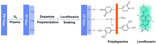 In this work, we prepared antibiotic PP mesh materials functionalized with dopamine via cold O2 plasma treatment. PP mesh fiber surfaces were activated with oxygen plasma to create hydroxyl or carboxyl groups and then plasma treated meshes were further modified with self-polymerized dopamine for 12–24 h. The PDA incorporated PP meshes were soaked in levofloxacin (0.5%) for 24 h to absorb water-soluble drugs for antimicrobial properties, as shown in Figure 1.