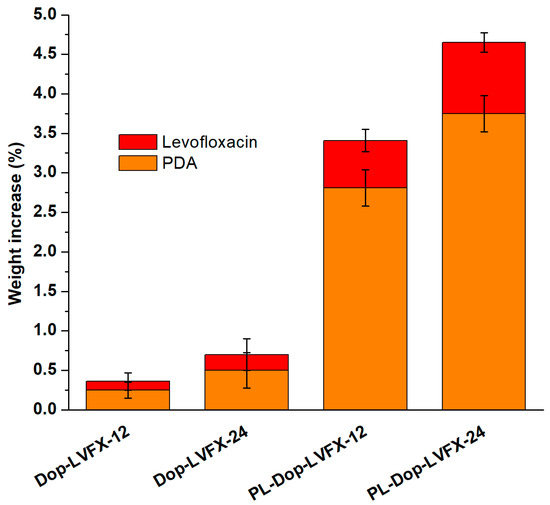 All modified PP meshes were soaked in the same concentration (0.6%) of levofloxacin for 24 h. Plasma treated and PDA coated PP meshes were weighed before and after loading levofloxacin. From Figure 2, PL-Dop-LVFX-12 and PL-Dop-LVFX-24 increase the corresponding weights by 0.6% and 0.9%, respectively. Moreover, samples without plasma treatment (Dop-LVFX-12 and Dop-LVFX-24) increase corresponding weight by only 0.2%. Therefore, non-plasma treated samples (Dop-24, Dop-LVFX-24) and plasma treated samples (PL-Dop-LVFX-12 and PL-Dop-LVFX-24) were prepared for further characterization.