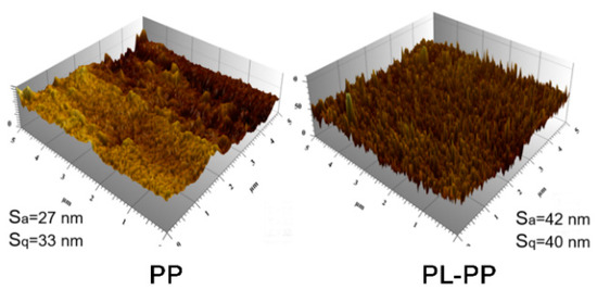 Surface roughness of PP control and PL-PP meshes were observed using an AFM (Figure 3). Prior to oxygen plasma activation the surface of untreated mesh fibers is smooth with obvious mark lines. After oxygen plasma modification, the surface of PP fibers becomes rougher and the surface piles are more visible, instead of line marks. Moreover, after the oxygen plasma treatment, Sq and Sa parameters of the modified meshes are increased by 55.5% and 21.2%, respectively, showing a rougher surface as compared to the PP control fibers. Therefore, oxygen plasma functionalization significantly changes the surface of PP meshes, which is consistent with the literature [28].