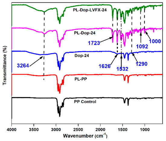 FTIR spectra of untreated and treated samples are shown in Figure 6. The PP control shows peaks at 2950, 2916, 1452, and 1376 cm−1 [17]. Thus, except for the PP control, PL-PP meshes display additional peaks at 3264 cm−1, which is due to the hydroxyl (−OH) on the surface of PP meshes. Moreover, it can be observed that Dop-24 shows slight vibration peaks at 1626 and 1532 cm−1, which is due to the establishment of ν C=O and δ NH, respectively. Furthermore, C–H (ν CH) stretch can be observed at 1290 cm−1. PL-Dop-24 shows similar peaks of 1626 and 1532 cm−1. More intensity of the absorbance band is found, which shows hydrogen bonding between PDA and PP meshes. Moreover, PL-Dop-LVFX-24 shows similar peaks as PDA coating peaks because levofloxacin was just loaded on the layer and did not react with PDA.