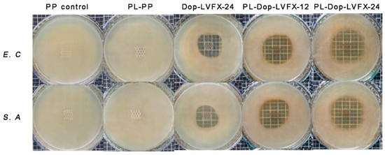 Inhibition zone diameter of PP control, PL-PP, Dop-LVFX-24, PL-Dop-LVFX-12, and PL-Dop-LVFX-24. All samples in the top row = E.C and the bottom row = S.A.