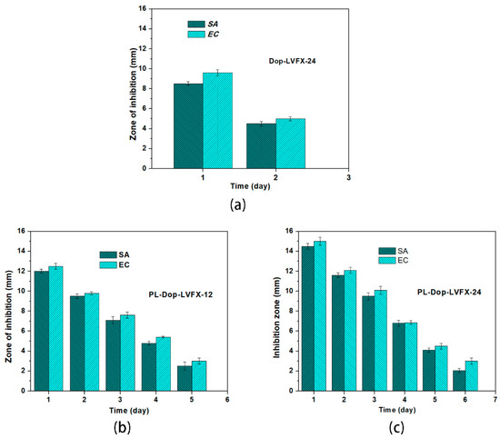 Moreover, antibacterial release properties of modified PP meshes (Figure 8) were determined after each 24 h. It can be observed that Dop-LVFX-24 exhibited antibacterial properties for only two days, as shown in Figure 8a. This may because less levofloxacin was adhered on the surface due to less PDA coating. However, PDA coated PP meshes, after plasma treatment for 12 h and soaked in the levofloxacin (Dop-LVFX-12), showed good antibacterial properties for 5 days, with a reduced regular inhibition zone throughout 5 days. The minimum inhibition zone on 5th day was 3 and 2.5 mm for E.C and S.A, respectively (Figure 8b). A bigger average inhibition zone was displayed by samples using E.C during the entire 5 days. Moreover, PDA coated meshes, for 24 h and soaked in levofloxacin (Dop-LVFX-24), demonstrated a more sustained antibacterial release for 6 days (Figure 8c). It was also observed that the inhibition zone of E.C was greater, in comparison to S.A, for an entire 6 days, but on 4th day almost the same inhibition zone was shown for the two types of bacteria. The minimum inhibition zone for E.C and S.A was 2.99 and 2.05 mm respectively.