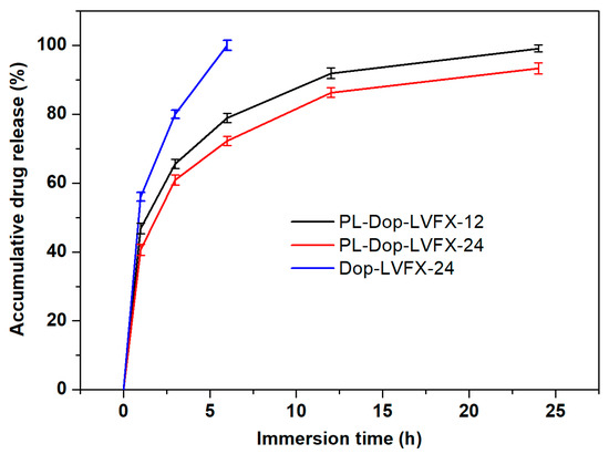 The average accumulative drug release (%) of three samples (Dop-LVFX-24, PL-Dop-LVFX-12, and PL-Dop-LVFX-24) was performed in a neutral environment using a PBS solution. From Figure 9 and Table 1, it can be observed that Dop-LVFX-24 showed fast drug release and about 100% of the drug was released within first 6 h, though a major portion (80%) of the drug was released within 3 h. Moreover, PL-Dop-LVFX-12 displayed a sustained drug release profile. In first 3 h, 65% of drug was released; after 6 h, the accumulative drug release was 78.8%; and after 12 h, 91.9% was released. Further sustained drug release (99.1%) continued up to 24 h. Moreover, PL-Dop-LVFX-24 displayed more sustained levofloxacin release compared to PL-Dop-LVFX-12. In the first 3 h, an accumulative 60.88% of the drug was released. After 6 h, 72.2% of levofloxacin was released. At 12 h, 86.3% of the drug was released and a total of 93.3% of drug was released at 24 h. Thus, PL-Dop-LVFX-24 samples showed sustained accumulative drug release. Drug releases of all three samples can explain antibacterial activity performance. The PL-Dop-LVFX-24 sample could be a suitable product and may be used for hernia mesh implantation.