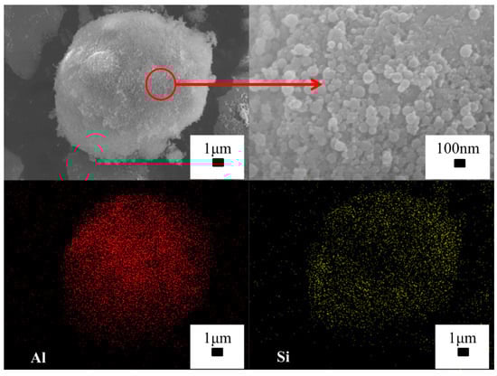 The synthesis of SiO2@Al through TEOS hydrolysis under alkaline condition is illustrated in Figure 1. The SEM-EDS results in Figure 2 indicated that Al powders were successfully encapsulated by SiO2 and thus SiO2@Al was obtained. The size of SiO2 encapsulating on the surface of Al powders was about 100 nm.