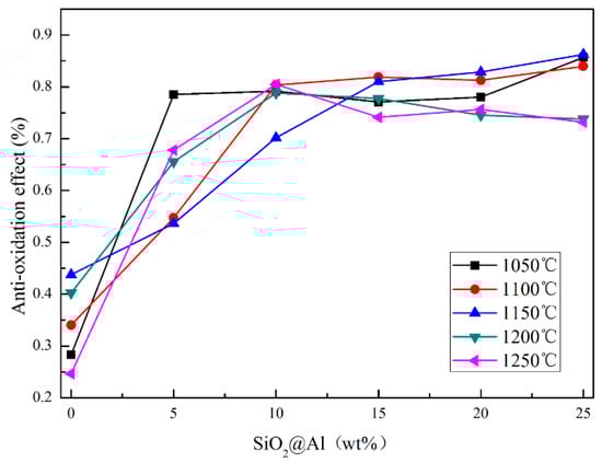The anti-oxidation performances of the coatings with different proportion of SiO2@Al were investigated by the weight loss during the heating process in muffle furnace. As shown in Figure 3, when temperatures ranged from 1050 to 1150 °C, a higher proportion of SiO2@Al led to a better anti-oxidation performance. However, when the proportion exceeded 10%, the enhancement of the anti-oxidation performance was not obvious. When temperatures ranged from 1200 to 1250 °C, the anti-oxidation performance of coating improved with the increasing amount of SiO2@Al until 10% and reduced with further SiO2@Al addition, especially at 1250 °C. Therefore, in view of the anti-oxidation performance and the cost, the ceramic coating with 10% of SiO2@Al was chosen as the appropriate one to conduct the following investigations.