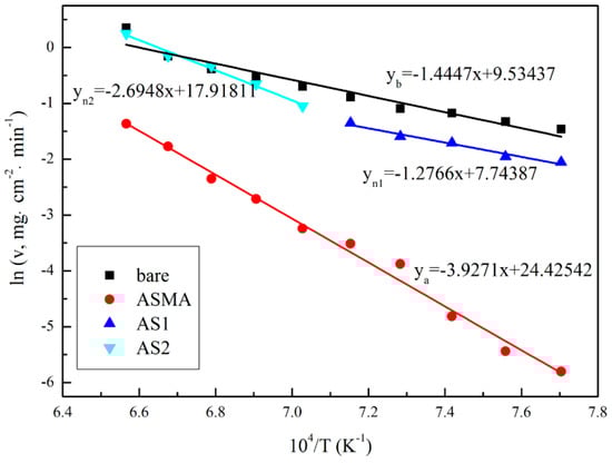 The non-isothermal kinetic for sample protected by ASMA, sample protected by AS, and bare sample are shown in Figure 4. The apparent activation energy, (Ea), was calculated by the Arrhenius equation. As shown in Equation (6), if the concentration of reactant (B) was constant, the reaction rate (v) would have a positive correlation with the reaction rate constants (k), which is the function of temperature described by Equation (7) (Arrhenius equation).