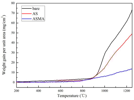 As shown in Figure 4, the apparent activation energy (Ea) of bare sample was 120.11 kJ/mol, while that of the sample protected by ASMA was 326.50 kJ/mol. The apparent activation energy (Ea) of the sample protected by AS between 1025 and 1150 °C was 106.14 kJ/mol, which was approximate to the bare sample. The apparent activation energy (Ea) of the sample protected by AS between 1150 and 1250 °C was 224.05 kJ/mol, which was between that of the sample protected by ASMA and the bare sample. Generally, higher apparent activation energy resulted in a better anti-oxidation performance of coating. Therefore, ASMA exhibited an excellent anti-oxidation performance between 1025 and 1250 °C, while AS only worked above 1150 °C. Additionally, the anti-oxidation performance of ASMA was much better than AS due to its larger apparent activation energy (Ea). To further prove the enhancement of anti-oxidation of ASMA, the non-isothermal experiment was conducted by a continuous thermo-balance. As shown in Figure 5, compared with AS, ASMA showed an obviously better anti-oxidation performance during the temperature-rise period.