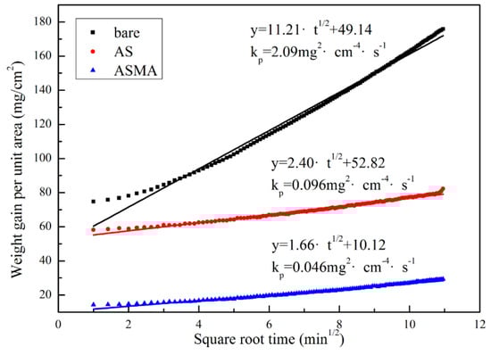 In this study, the linear relationship between and 1/2 was used to evaluate kp [2]. As shown in Figure 6, the reaction rate constant (kp) of the bare sample, the sample protected by AS, and the sample protected by ASMA was 2.09, 0.096, and 0.046 mg2·cm−4·s−1, respectively. It can be concluded that ASMA possessed a better anti-oxidation performance than AS due to its smaller reaction rate constant at 1250 °C.