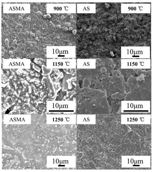 The microstructure was an intuitive evidence for evaluating the compactness of coating which controlled the inner diffusion rate of oxygen. Therefore, anti-oxidation performance of coating was better with a more compact structure. The outer-surface microstructures of sample protected by the ASMA and sample protected by the AS were investigated after the thermal treatments of different temperature (900, 1150, and 1250 °C). As described in Figure 7, ASMA formed a compact structure at 900 °C and the compactness improved with the increasing of temperature until 1250 °C. The amount of liquid phase increased with the rising temperature, the porosity reduced and thus the sintering of coating was enhanced at the same time. However, the sample protected by AS possessed a porous structure composed of isolated particles at 900 °C, while the compactness improved at 1150 °C. The above results suggested that SiO2@Al could accelerate the sintering of the ceramic coating and enhance the compactness.