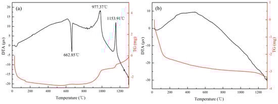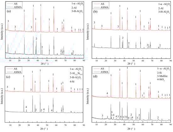 Figure 8 showed the TG-DTA data of the ASMA and AS slurry. As shown in Figure 8a, there was an endothermic peak at about 662.85 °C, an exothermic peak at 977.7 °C, and an exothermic peak at 1153.91 °C for ASMA slurry, while there was only a gradual exothermic trend during heating process for AS slurry. In order to interpret the possible reactions during the heating process, the phase transitions were investigated by XRD method at 500, 800, 1100, and 1250 °C, which were near the endothermic or exothermic temperature. Compared with Figure 9a,b, it was found that no specific phase formed between 500 and 800 °C, thus the endothermic peak at 662.82 °C could be attributed to the melting of Al powders in SiO2@Al. Phases of Si and Al3.21Si0.47 were newly formed within ASMA when temperature increased from 800 to 1100 °C, which indicated that an exothermic reaction occurred as described in Equation (11) and it gave rise to the exothermic peak at 977.7 °C [25]. Compared with Figure 9c,d, it was remarkable that mullite and cristobalite formed within ASMA when temperature ranged from 1100 to 1250 °C. Therefore, the exothermic peak at 1153.91 °C might result from the exothermic reaction expressed as Equations (12) and (13) [26,27]. In contrast, there was no new phase formed within AS during the whole heating process except for cristobalite. To sum up, the Al powders in SiO2@Al melted at 662.85 °C and reacted with SiO2 on its surface, which generated local high temperature and the sintering of ceramic raw materials, thus contributing to its excellent anti-oxidation performance, which was consistent with the non-isothermal kinetics. Besides, mullite and cristobalite formed at 1150 °C could further enhance the coating compactness and improve the anti-oxidation performance above 1150 °C [19]. However, ceramic raw materials just sintered above 1150 °C within AS, and thus showed an unobvious anti-oxidation effect below this temperature.