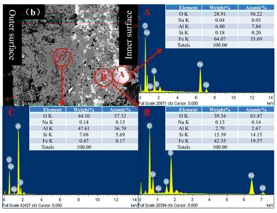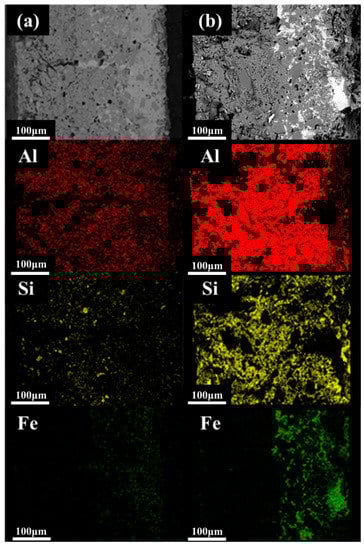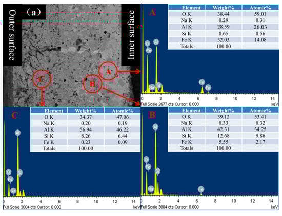 According to the SEM-EDS results of coating cross-sections exhibited in Figure 10, both the coatings were able to prevent the carbon steel substrate from oxidization at 1250 °C. Compared with Figure 11a,b, ASMA was composed of a hercynite layer, a mullite layer, and a ceramic layer with high aluminum content, while AS consisted of a Fe3O4 layer, an olivine layer composed of FeO and 2FeO·SiO2, a ceramic layer composed of Al2O3 and cristobalite. Equations (14) or (15) possibly occurred to form the hercynite (Al2O3·FeO) within ASMA. As reported in the literature [28], the structure of hercynite could be expressed as (Fe2+1−xAl3+x)tet(Al3+2−xFe2+x)octO4 where 0 < x < 0.25, while that of Fe3O4 could be expressed as (Fe3+)tet(Fe3+Fe2+)octO4 [29]. Referring to Freer and O’Reilly [30], the diffusion activation energy of Fe2+ at octahedral site and tetrahedral site were 0.2(±0.05) eV and 0.71 (±0.09) eV, which indicated that the diffusion of iron ions within hercynite was slower than Fe3O4 due to the lower fraction of Fe2+ occupied the octahedral site. Therefore, hercynite also played a significant role for enhancing the anti-oxidation ability of ASMA. However, hercynite was easily oxidized as shown in Equation (16) under oxidation condition. As mentioned in Section 3.1, the compactness of ASMA was greatly improved with the addition of SiO2@Al, which effectively prohibited the inner diffusion of oxygen. As a result, the hercynite layer could be stable within the ceramic coating. The result agreed well with the finding in isothermal kinetic experiment.