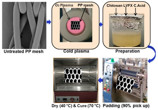 Polypropylene (PP) meshes were first surface activated using O2 plasma treatment at low pressure, after which the PP meshes were padded (pick up 90%) with a prepared solution of chitosan and levofloxacin HCl containing citric acid as a cross-linking agent, as shown in Figure 1. The padded PP mesh devices were dried (40 °C) and cured (70 °C) in an oven for 10 min. The surface morphology, chemical composition, and structural changes of the plasma treated chitosan and levofloxacin HCl-coated PP meshes were characterized using scanning electron microscopy (SEM), energy dispersive X-ray (EDX) spectroscopy, and Fourier transform infrared (FTIR) spectroscopy. Results revealed that the PP mesh was connected with chitosan through the oxygen plasma treatment. Thus, a thin layer of chitosan and levofloxacin HCl was observed on the surfaces of the PP meshes. Furthermore, antimicrobial properties of chitosan and levofloxacin HCl-coated PP meshes were performed via an agar diffusion plate by release properties. Thus, the chitosan and levofloxacin-modified devices demonstrated an excellent antimicrobial zone of inhibition and sustained antimicrobial release properties for six continuous days.