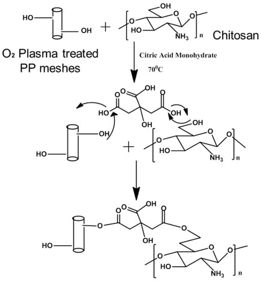 Reaction scheme of cross-linked chitosan with oxygen plasma-treated PP meshes using citric acid.