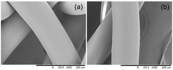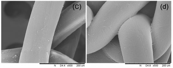 SEM images of chitosan and levofloxacin HCl-modified plasma-treated and -untreated PP meshes are shown in Figure 3. It can be observed that the untreated PP meshes display noticeable line marks on their surfaces (Figure 3a) with bright surface structures, but after oxygen plasma treatment such line marks are missing, showing (Figure 3b) relatively dull and even surfaces. The plasma-treated fibers have regular surfaces in comparison to the untreated meshes. Moreover, the low molecular weight chitosan and levofloxacin-coated meshes display (Figure 3c) an even thin layer across the whole spherical diameter of the fibers. However, it can be observed that the medium weight chitosan and levofloxacin HCl completely coated the (Figure 3d) plasma-activated PP fibers with a thick and sticky layer. It can be seen that the sticky layer (the CH-MMW) stretches across the whole surface of the PP fibers, showing a more even coating than the CH-LMW coating. Thus, it can be summarized that medium molecular weight chitosan can coat PP fibers more effectively. The reason for the thick and even surface coating may be the oxygen plasma treatment, which may enhance the adhesion of the chitosan and levofloxacin HCl coating [].