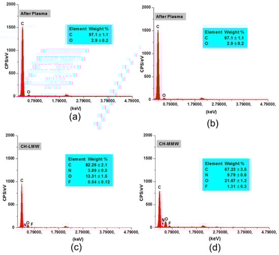 Energy dispersive X-ray (EDX) spectra: (a) PP control, (b) oxygen plasma-functionalized, (c) low molecular weight chitosan and levofloxacin, and (d) medium molecular weight chitosan and levofloxacin HCl-coated PP meshes.