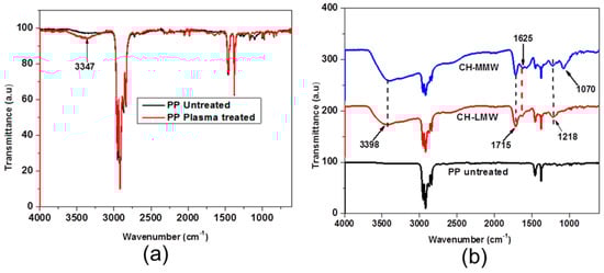 Fourier transform infrared (FTIR) spectra (attenuated total reflection (ATR)): (a) PP control and oxygen plasma-treated PP meshes; (b) PP control, CH-LMW, and CH-MMW and levofloxacin-coated PP meshes.