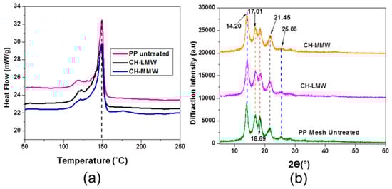 Thermal and structural properties: (a) differential scanning calorimetry (DSC) analysis and (b) X-ray diffraction (XRD) patterns of treated and untreated PP meshes.