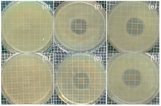 Antibacterial activity by inhibition zone: (a,b) PP control, (c,d) low molecular weight chitosan and levofloxacin-coated, (e,f) medium molecular weight chitosan and levofloxacin HCl-coated. Note: the top row is SA and the bottom row is EC.