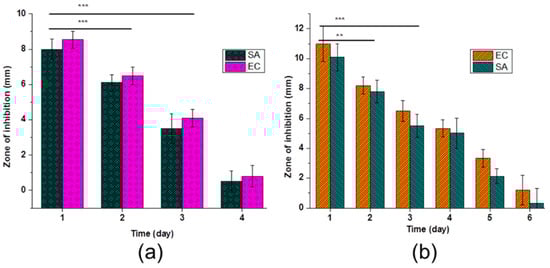Thus, it was confirmed that PP control does not exhibit antibacterial properties. For this reason, the CH-LMW and CH-MMW samples were assessed for their antimicrobial release properties. Both samples (CH-LMW and CH-MMW) were further tested (Figure 8) against SA and EC by a release method. As shown in Figure 8a, the average initial inhibition zones for the CH-LMW samples for the first day against SA and EC were 8.01 and 8.533 mm, respectively. CH-LMW demonstrated antibacterial release properties for four days against SA and EC bacteria. EC displayed a bigger inhibition zone than SA over the four days. However, the minimum inhibition zones for SA (0.5 mm) and EC (0.8 mm) were measured on the fourth day.
