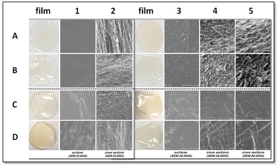 Figure 1 shows the images of the different films and their surfaces and cross-sections obtained from the SEM analysis. The control, PEC-based films, prepared in the absence of GLY and MSNs, appeared to be more compact and homogenous, in both, the surface (Figure 1,A1) and the cross-section (Figure 1, inset A2), than the control CH films (Figure 1, insets C1 and C2). The presence of MSNs conferred to the surface of the PEC-based films, prepared either in the presence or absence of GLY, an even more compact and homogeneous structure, compared to the control films, probably due to a widespread inclusion of MSNs, into the PEC network responsible for the major smoothness of the matrices obtained (Figure 1, inset A3 and B3). This hypothesis seemed to be confirmed from the film cross-section SEM images, at 25,000× magnification, which shows a more compact and homogeneous structure of the MSN-containing film matrices, exhibiting more evident continuous zones, in comparison with the control sample (Figure 1, inset A4 and B4), as well as from the zoomed SEM micrographs (obtained at 50,000× magnification), showing the pervasive inclusion of nanoparticles in the PEC film matrix (Figure 1, inset A5 and B5). Numerous aggregations were observed, by contrast, in the cross-sections of the CH-based films prepared in the presence of MSNs, without (Figure 1, inset C4 and C5) or with (Figure 1, inset D4 and D5) GLYs. In fact, these films exhibited many protuberances or fractured morphology, probably due to the MSNs interactions with the CH chains. These results were similar to those reported by Liu et al. [20], who found that the ultrastructure of the starch-based materials was much rougher and exhibited numerous aggregations, due to the asymmetrical MSN dispersion in the film matrix.