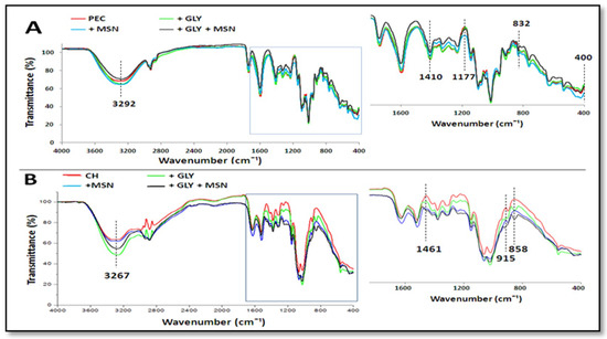 FT-IR spectra of PEC (A) and CH (B) films prepared in the presence or absence of GLY or MSN.