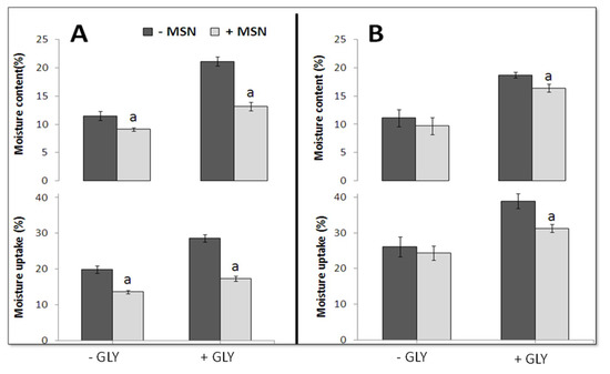 Effect of MSN on moisture-content and uptake of PEC (A) and CH (B) films, prepared with or without GLY. “a” values significantly different at p < 0.05, from those obtained without MSN.