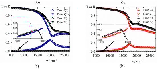 Concerning the optical properties, let us first mention that all spectra could be well fitted by means of the chosen dispersion approach in Equations (1), (2), and (6), assuming α = β, such that a total of only seven independent dispersion parameters (two Drude parameters and five β_do parameters) were necessary to model the optical constants. The film thicknesses of the films on fused silica and silicon appear as additional parameters for the spectra fits. Figure 2 demonstrates the achieved fit quality for a gold (Figure 2a) a copper (Figure 2b) sample. The chosen dispersion approach obviously results in excellent spectra fits.