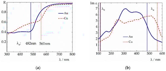 In Figure 4, the obtained model parameters λa/b = 1/νa/b are visualized in relation to characteristic features in the gold and copper bulk reflection spectra (Figure 4a) and in the imaginary part of the dielectric function (Figure 4b) []. Obviously, the parameters λa mark the onset wavelength of strong interband absorption structures in the spectra, while λb-λa gives some effective width (in wavelength units) of the modeled interband absorption structure. Note that the νa values as obtained from our fits (Table 3 and Table 4) are consistent with the theoretical νa0 data (Table 1) in the sense that  is fulfilled.