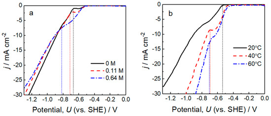 Cathodic polarization curves were measured on brass, in order to investigate Fe-P electrodeposition (Figure 1). The polarization curves were divided into two regions (by a dashed line). The reaction in the first region is mainly related to hydrogen evolution. In the second region, hydrogen evolution and Fe-P deposition coexisted. Figure 1a shows the influence of the glycine, Gly, content in the electrolyte at 20 °C. The current density waves starting at ca. −0.5 V represent the proton reduction without Fe-P electrodeposition. An increase of the bath temperature caused a higher hydrogen evolution (Figure 1b). When the temperature of the Fe-P electrolyte (with Gly = 0.64 M) was increased from 20 up to 60 °C, the reduction potential shifted to the anodic direction and the current density, j, for the metal reduction reactions increased due to a higher electron transfer rate and complex stability.