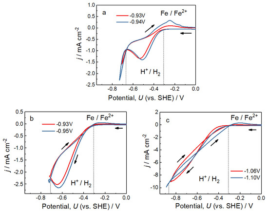 The study of the Fe-P deposition potential with varying Gly concentration was performed by cyclic voltammetry (Figure 2). The potential transients were starting from the individual OCP to the negative direction with various reversal potentials. The first appearance of the anodic stripping peak correlates to the Fe-P deposition potential that is caused by the second current density wave. Cyclic voltammetry shows that the onset of the cathodic Fe-P deposition shifts to more negative potentials with increasing Gly concentration. It should be taken into account that the current density scale of Figure 2c contrasts to that of Figure 1a,b, when comparing the cathodic current waves. Table 1 shows the average potential of the second current density wave. The addition of Gly decreased the deposition rate caused by the competing hydrogen evolution. Therefore, the high concentration of adsorbed hydrogen species (H+, compare [33]) decreased the active surface area for metal deposition.