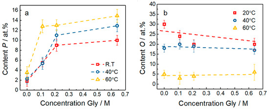 The dependency of (a) phosphorus and (b) oxygen contents of the Fe-P alloy coatings on the Gly concentration in the electrolyte at various electrolyte temperatures; j = 30 mA cm−2.
