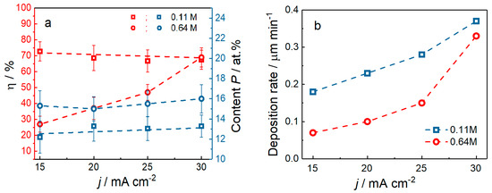 The results of the respective current efficiency, η, of the Fe-P alloy deposition together with the P layer content (Figure 4a) and the deposition rate (Figure 4b) are presented versus the applied current density at 60°. The chosen temperature is 60 °C, because it shows the best coating quality (roughness) and the lowest oxygen content. Current efficiency and the deposition rate were determined based on Faraday’s law [31]. The phosphorous content is practically unaffected by j. However, the P concentration increases drastically with the glycine concentration of the bath. The influence of the Gly concentration on the η, is significant at low j (glycine reduces η) and practically disappears at increased values, i.e., at 30 mA cm−2. The deposition rate is increasing with j (Figure 4b).