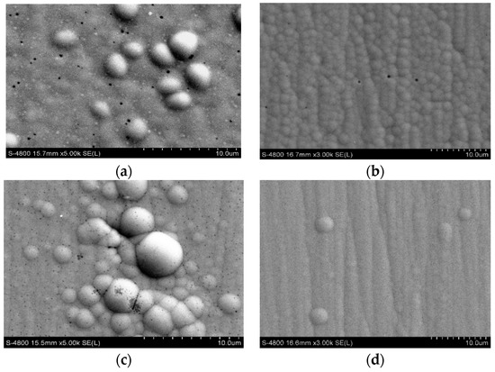 Morphology (SEM images) of Fe-P coatings electrodeposited at various Gly concentrations and current densities, j, at 60 °C. (a) Fe-12 at.% P (je = 15 mA cm−2, c[Gly] = 0.11 M); (b) Fe-13 at.% P (je = 30 mA cm−2, c[Gly] = 0.11 M); (c) Fe-14 at.% P (je = 15 mA cm−2, c[Gly] = 0.64 M); and (d) Fe-16 at.% P (je = 30 mA cm−2, c[Gly] = 0.64 M).