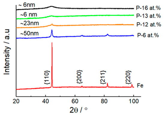X-ray diffraction patterns of Fe-P alloys with varying P contents. The coatings were electrodeposited at 30 mA cm−2 and 60 °C from electrolytes containing various Gly concentration: 0 M (Fe-6 at.% P), 0.11 M (Fe-12 at.% P), 0.21 M (Fe-13 at.% P), and 0.64 M (Fe-16 at.% P).