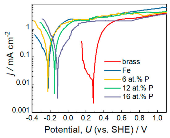 In order to simulate acidic rain in an industrial environment, the corrosion properties of electrodeposited Fe-P coatings with various alloy compositions were investigated in 0.05 M H2SO4 (pH 1.4). The average coating thickness was around 10–12 µm. The phosphorous content of the samples were varied from 6 at.% to 16 at.% (cf. Figure 5b,d and Figure 6). The corrosion resistance ρcorr of a pure Fe coating and bare brass was also evaluated (Figure 7) as reference samples. The corrosion resistance is shown in Table 3 based on the corrosion potential Ucorr and the corrosion current density jcorr which is determined by the intersection of the cathodic and anodic Tafel line extrapolations.