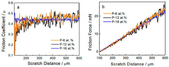 The wear behavior of the Fe-P coating was studied for the different investigated samples. Although similar performance is observed for the three investigated conditions, a smother friction force curve as a function of the scratch distance is observed for the Fe-16 at.% P coating when compared with the curves of the Fe-6 at.% P and Fe-12 at.% P coatings. The sharp drops observed in the friction force curves and in the friction coefficient curves (Figure 9a,b) can be ascribed to the inhomogeneous morphology observed by SEM (Figure 5). Nonetheless, no mechanical failure is observed for any of the investigated coatings in the measured range.