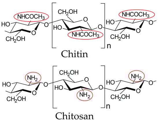 The microcapsule should be stable and retain its integrity throughout the digestive tract passage until it arrives at its target destination, where the capsule should disintegrate and release its contents [74]. Coating adds an extra protective layer on the microcapsule surface, therefore resulting in improved mechanical strength and a strong barrier function. This process involves the immersion of the hydrogel particles into a solution of coating polymer [35]. The main advantages of chitosan coating are unique cationic character, high biocompatibility, non-toxicity, and biodegradability; therefore, it is quite suitable for use in the food and pharmaceutical industries. Its origin lies in the shell waste of crab, shrimp, and crawfish [25]. The origin source influences the molecular weight of chitosan, which is responsible for its crystallinity, degradation, tensile strength, and moisture content, but can be decreased with processing for increasing the deacetylation [75]. This type of coating is of a major interest in the field of targeted release of probiotics due to its high compatibility with living cells [76]. Chemically speaking, chitosan (Figure 1) is a polysaccharide composed of (1, 4)-linked 2-amino-deoxy-b-d-glucan, a deacetylated derivative of chitin. Chitosan ranges second after cellulose in terms of its availability in nature [77]. The degree of deacetylation of chitin represents the major aspect in chitosan’s characterization [78]. For example, when the degree of deacetylation of chitin overcomes 50%, chitosan becomes soluble in aqueous acidic conditions [79]. Moreover, the homogeneous or heterogeneous deacetylation conditions have an important impact on chitosan’s microstructure [80], which mainly determines its solubility and applications (i.e., drug or food carriers) [78]. Figure 1 below illustrates the differences between chitin and chitosan, as chemical structures.