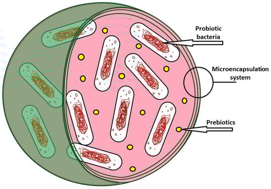 Microencapsulation represents the main modern solution for preserving probiotic viability. By definition, microencapsulation represents an incorporation process of probiotic bacteria into a specific material or membrane that has the ability to reduce cell injury or cell loss, derived from environmental factors, with a controlled-release rate under specific conditions [30,31]. Therefore, this technique has been extensively studied during the last decade, since it can maintain the beneficial properties even for sensitive bacteria during storage and absorption [25]. Many studies and reviews have been conducted to investigate and summarize the protective role of this technique [32,33,34,35].