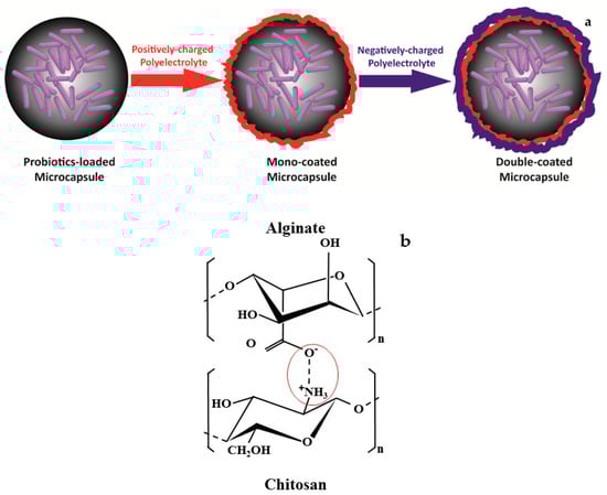 Chitosan demonstrated to be the most satisfying material to protect microencapsulated probiotics, having efficient results in a variety of alginate microcapsules (performed by different techniques and with different types of alginate), probiotics strains, and exposure conditions. The improved capsule stability and efficient protection was due to the strong ionic interactions between alginate (anionic group) and chitosan (cationic group). Figure 3a illustrates more details regarding this process, where initial microcapsules produced by an anionic encapsulation material (e.g., alginate) was consecutively coated by a cationic material (e.g., chitosan) and after that by another anionic material. The electrostatic forces involved, due to the polyelectrolyte properties of the biopolymers, will contribute to the layer formation that will coat the probiotic-loaded microcapsule [97]. Their ionic interaction representation is illustrated in Figure 3b.